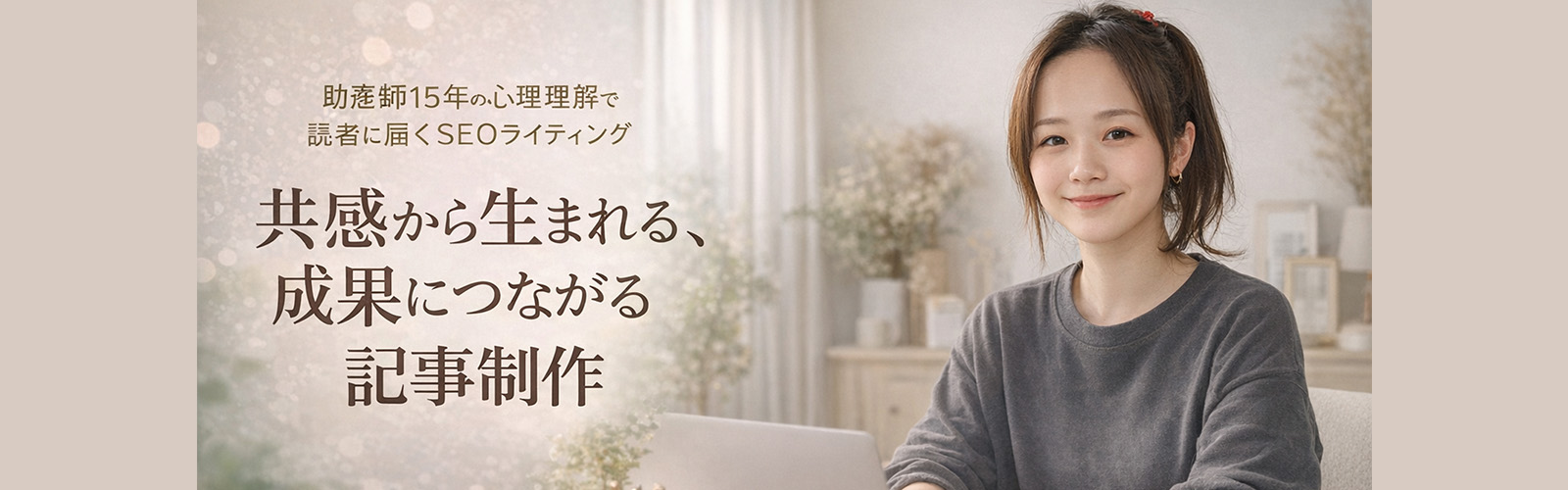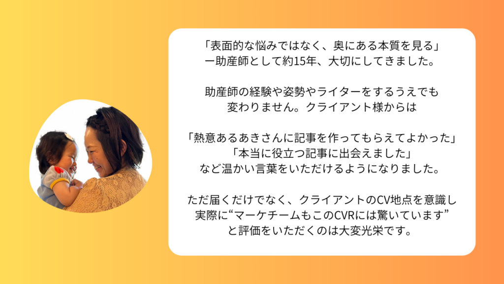 私は、これまでの人生や助産師として培った人の本音を引き出す力で、読者の辿ってきた道のり(ジャーニー)に寄り添います。読者の真のニーズを捉え、クライアント様の成約という結果に結びつく記事を提供します。